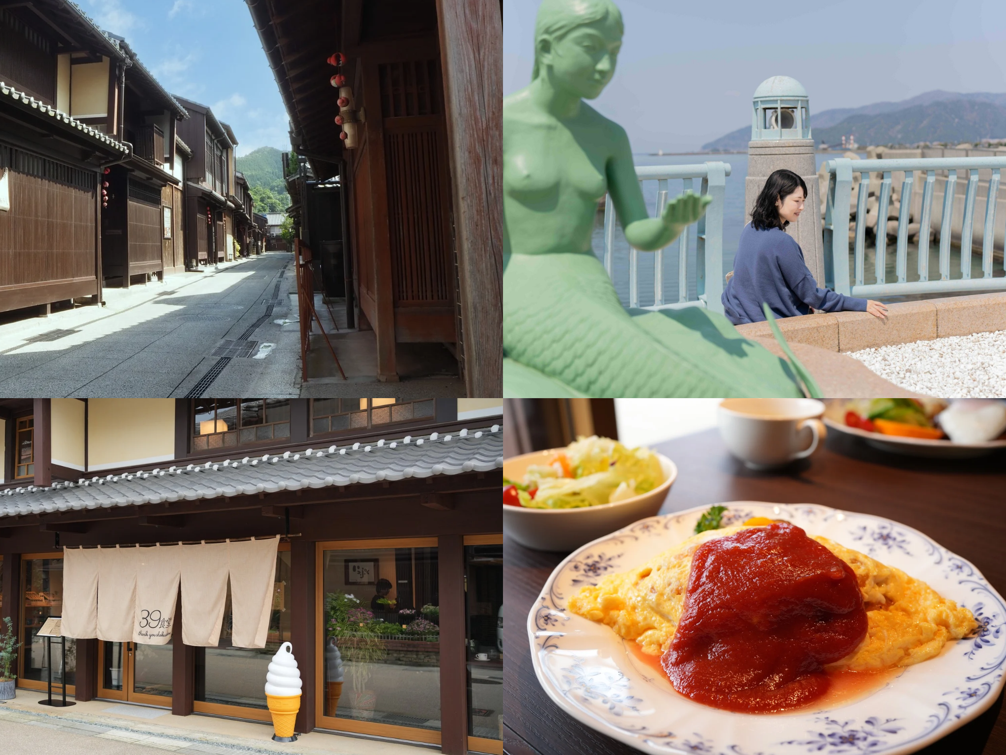 風情が残る三丁町には、町屋をリノベーションしたカフェが点在。 町並みに溶け込むカフェで、かわいいスイーツやランチを楽しむ時間。 食後はマーメイドテラスへ。 海風に吹かれながら潮の香りを感じ、写真を撮るとまるで絵葉書のよう。