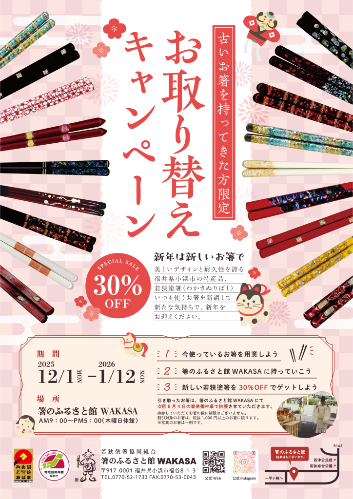 新年は新しいお箸で美しいデザインと耐久性を誇る福井県小浜市の特産品、 若狭塗箸(わかさぬりばし) いつも使うお箸を新調して新たな気持ちで、新年をお迎えください。 引き取ったお箸は、箸のふるさと館 WAKASAにて次回8月4日の箸供神事で供養させていただきます。 持参していただくお箸の数に制限はございません。 割引対象のお箸は、税抜1,000円以上のお客に限ります。 ※写真のお客は一例です。