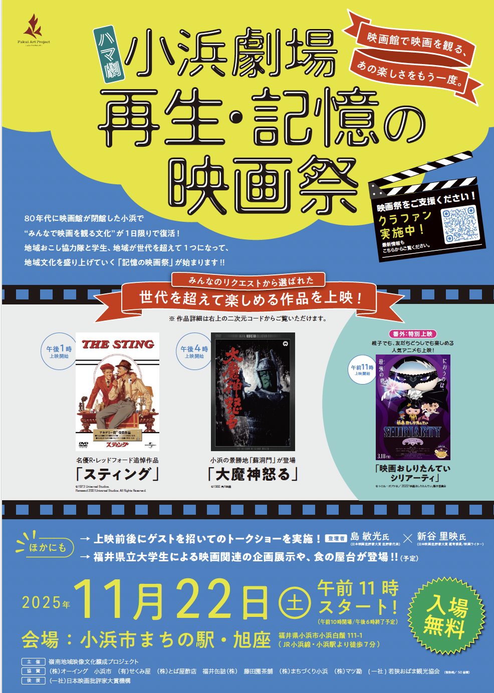 80年代に映画館が閉館した小浜で”みんなで映画を見る文化”が1日限りで復活! 福井県小浜市の歴史ある芝居小屋「旭座」で、 1日限りで映画館が復活します。 また、映画上映前後にゲスト( 島 敏光氏、新谷 里映氏)を招いてのトークショーや福井県立大学生による映画関連の企画展示や、食の屋台が登場予定! 上映作品 「映画おしりたんていシリアーティ」 午前11時〜 「スティング」午後1時〜 「大魔神怒る」午後4時〜 11月22日は旭座で映画を見て楽しんでみてはいかがですか? またクラウドファンディングも大募集中です! ご協力をお待ちしています。