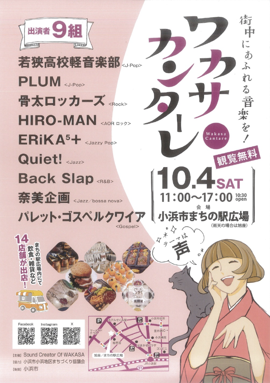 毎年、福井県小浜市を中心に開催している音楽イベント 「ワカサカンターレ」 今年は10月4日(土)開催いたします。 キッチンカーやアクセサリーなどの出店もいっぱい。 秋の心地よい時間を野外ステージでお楽しみください。 【会 場】 小浜市まちの駅広場(雨天の場合は旭座) 【お問い合わせ】 小浜市まちの駅0770-52-2000