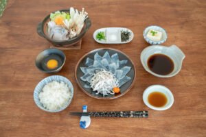 小浜の阿納(あの)地区などを中心に、生産現場と食卓が直結しています。さっきまで生け簀で泳いでいたふぐを捌くため、透き通った「てっさ」の輝きと鮮度は格別です。