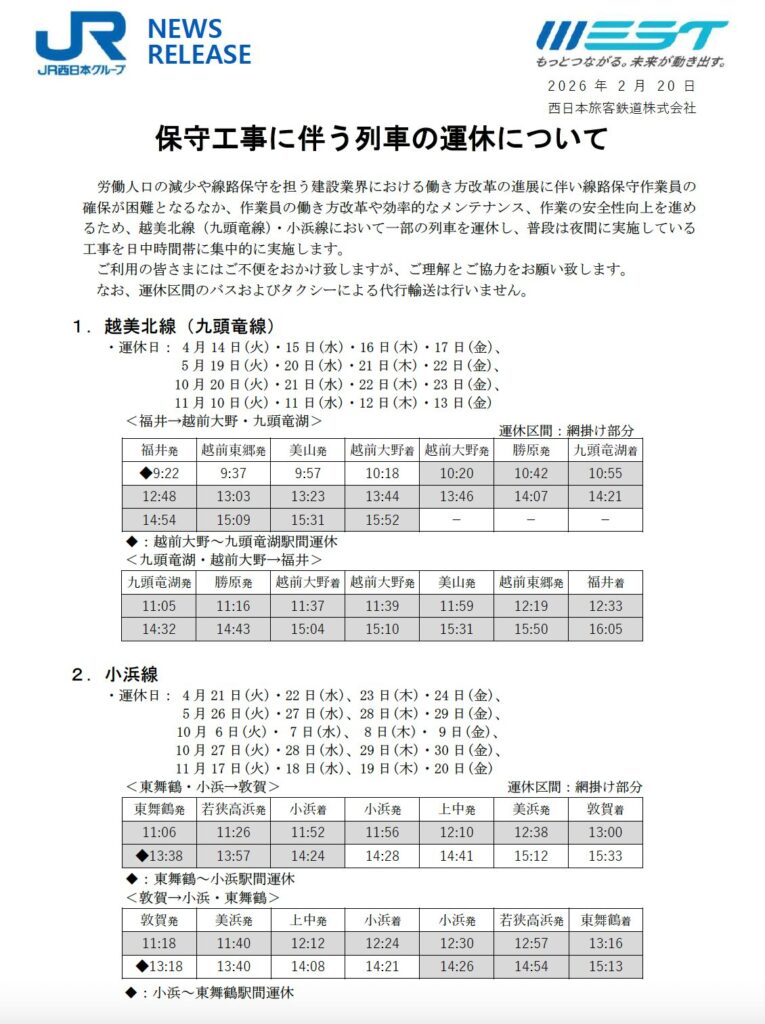 労働人口の減少や線路保守を担う建設業界における働き方改革の進展に伴い線路保守作業員の確保が困難となるなか、作業員の働き方改革や効率的なメンテナンス、作業の安全性向上を進めるため、越美北線(九頭竜線)・小浜線において一部の列車を運休し、普段は夜間に実施している工事を日中時間帯に集中的に実施します。