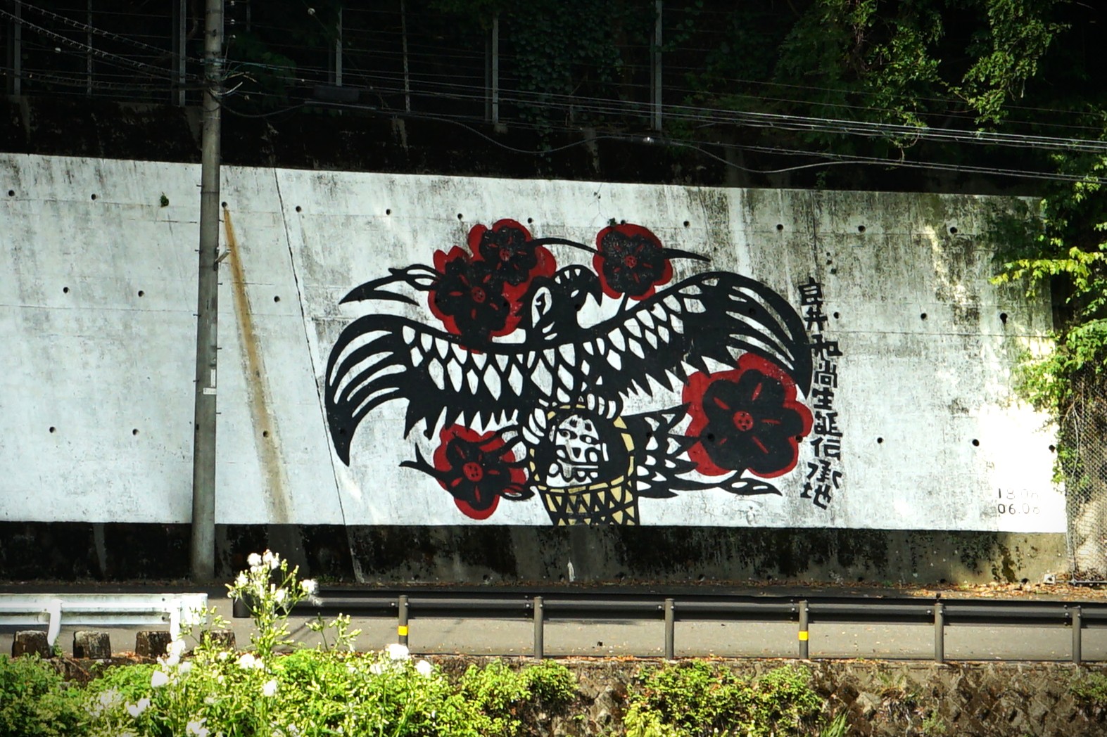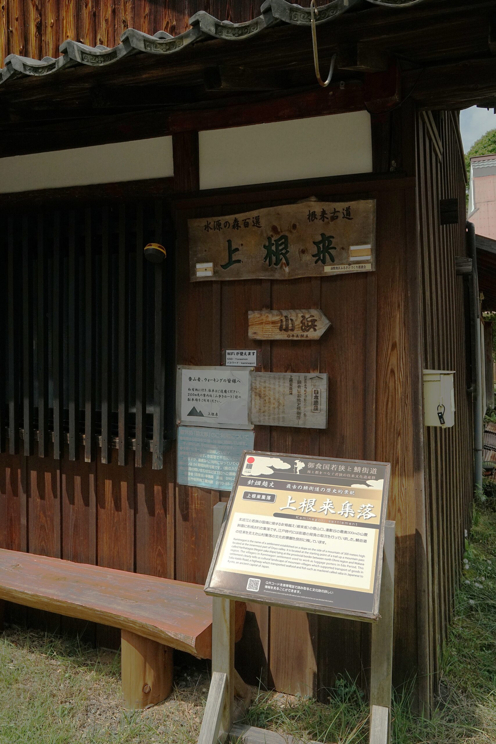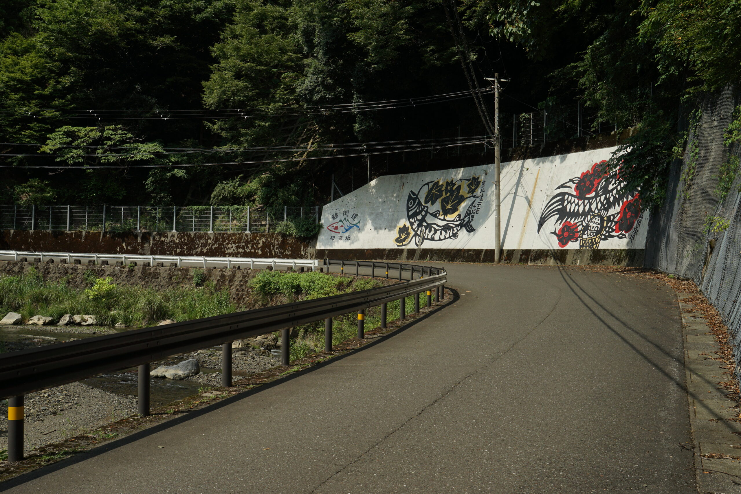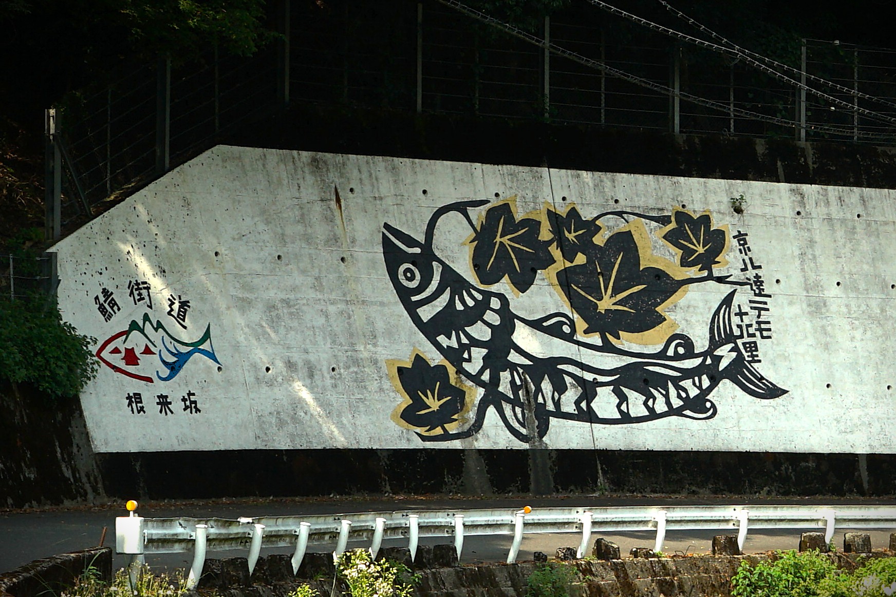 鵜の瀬から約1kmほど進むと、大きな「壁画」が目に入りました。そこには「鯖街道」「根来坂」と書かれています。このあたりは、かつて京都へとつながる「鯖街道」が通っており、のちほど紹介する「針畑越え」などのルートも、この道沿いから歩いて行くことができます。