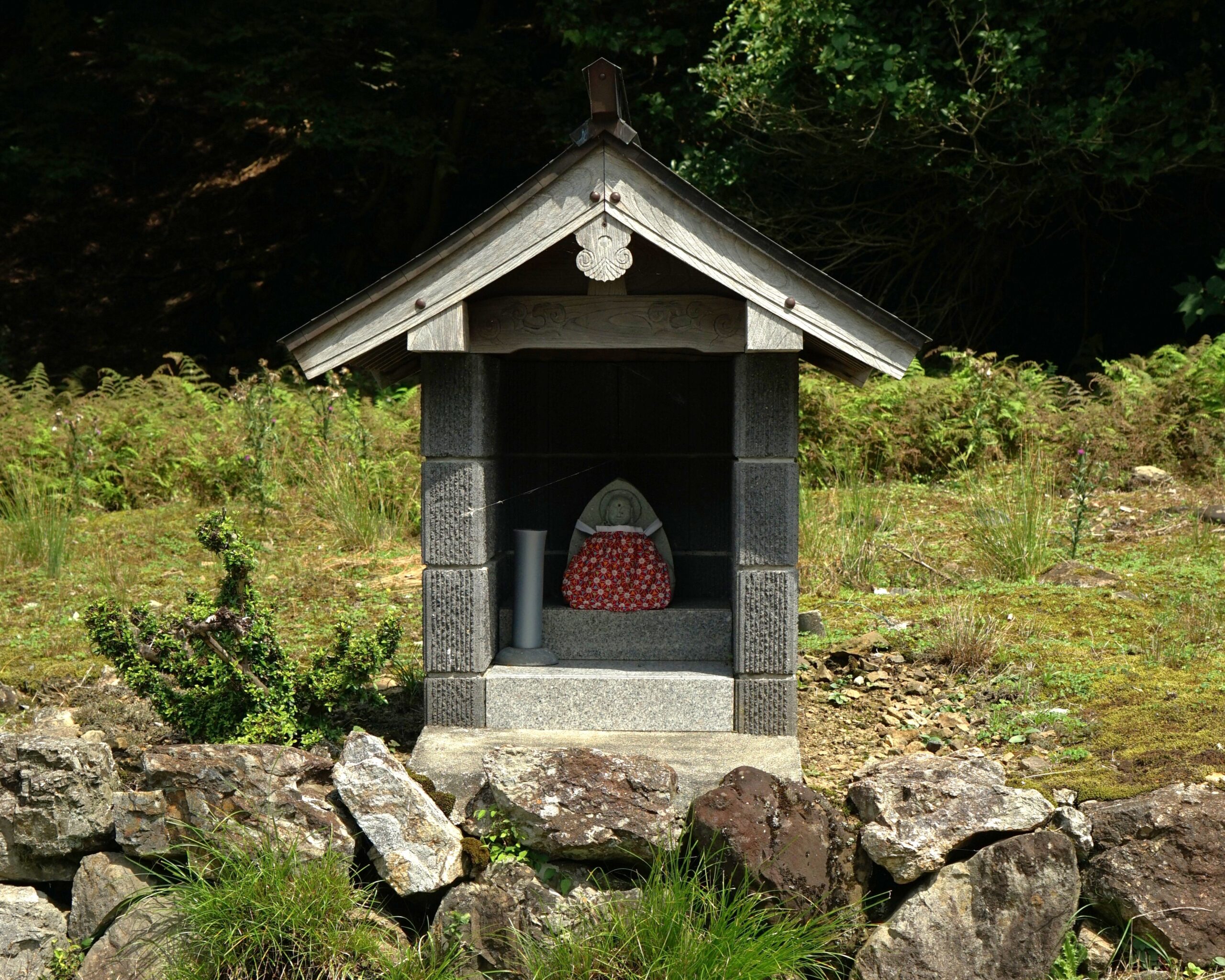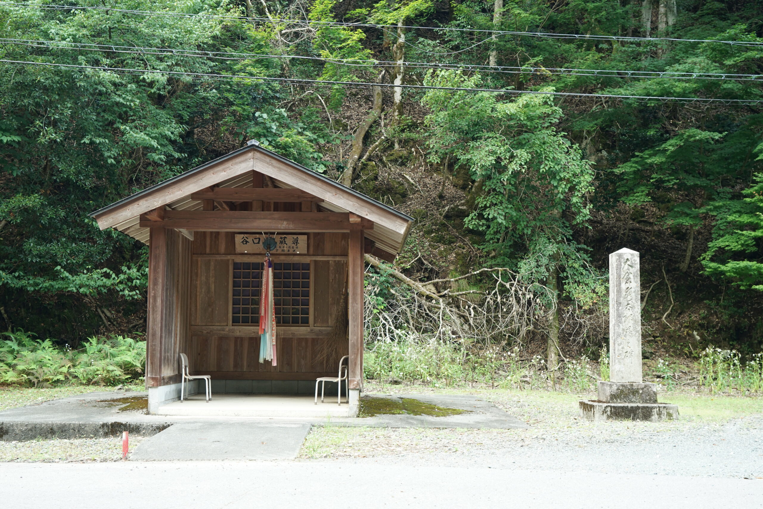 下根来地区からおよそ1.5km進むと、道路右手に小屋が見えてきます。こちらは「谷口不動尊」で、地元の名士の石碑と並んで鎮座していました。小屋の中には椅子もあり、ハイキングや鯖街道を越える人の休憩所としても利用できそうです。