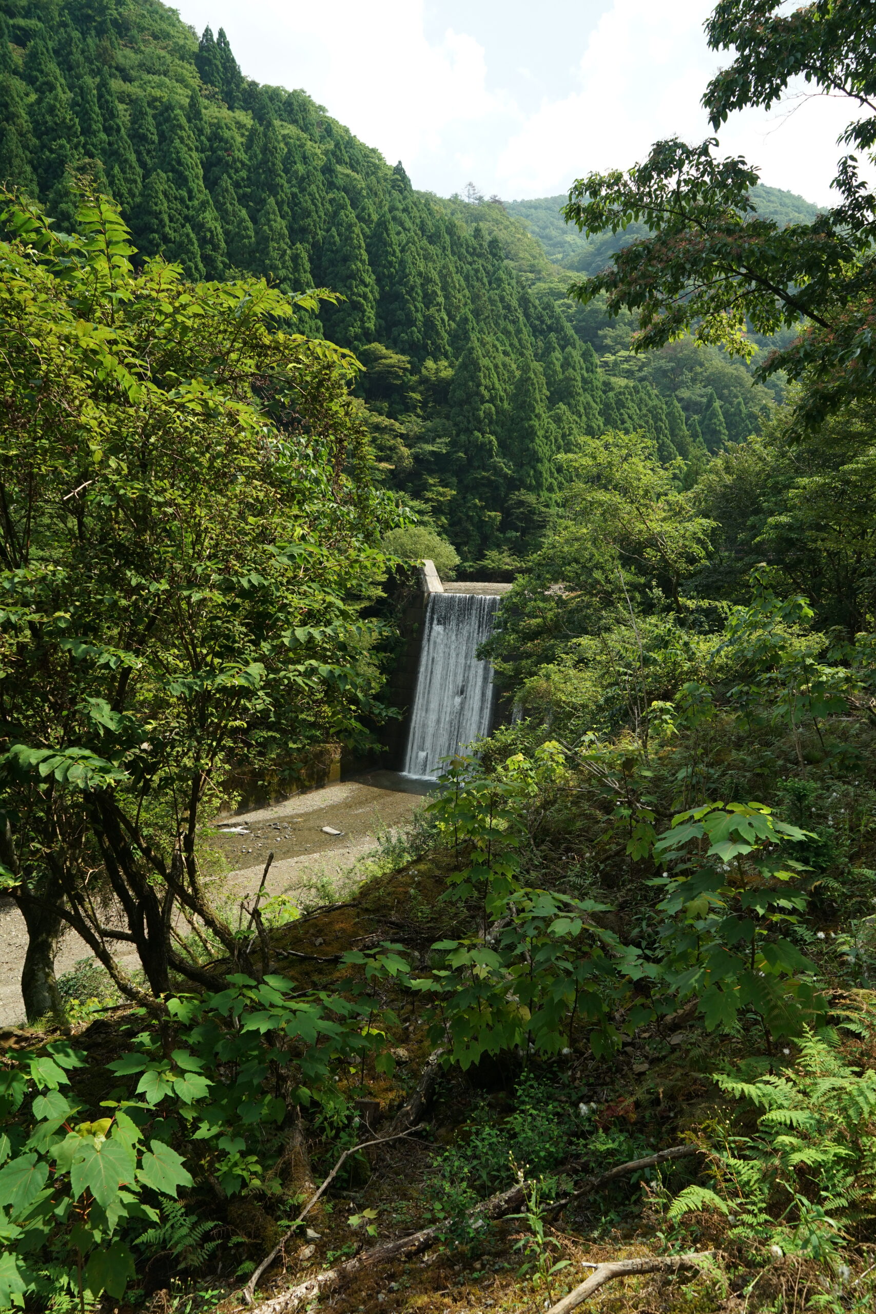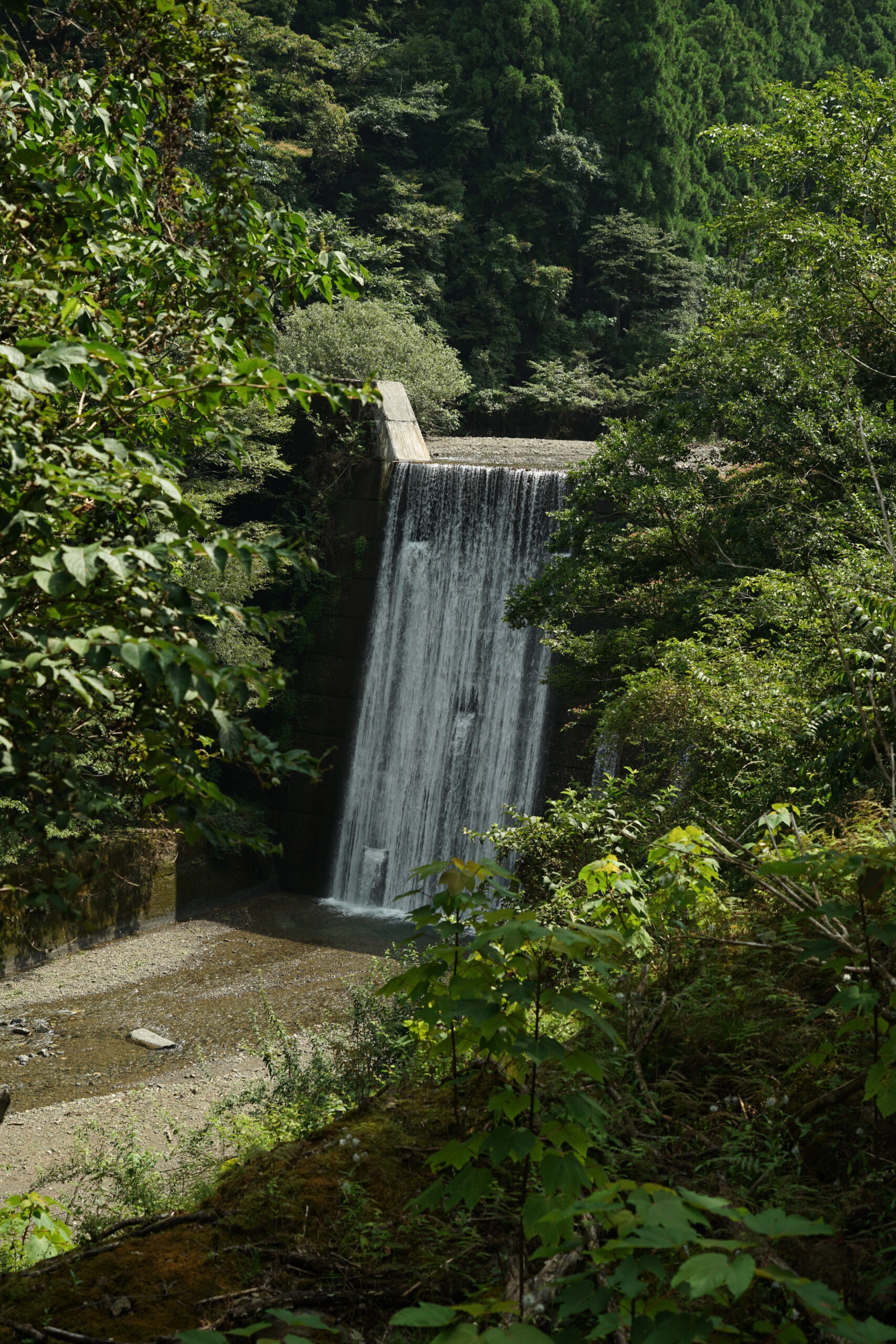 谷口地蔵尊からさらに上流へ進むと、砂防ダムが姿を現します。自然の中にたたずむその姿は、まるで滝のようで、思わず足を止めて見入ってしまいました。流れ落ちる水音も心地よく、しばし癒されます。