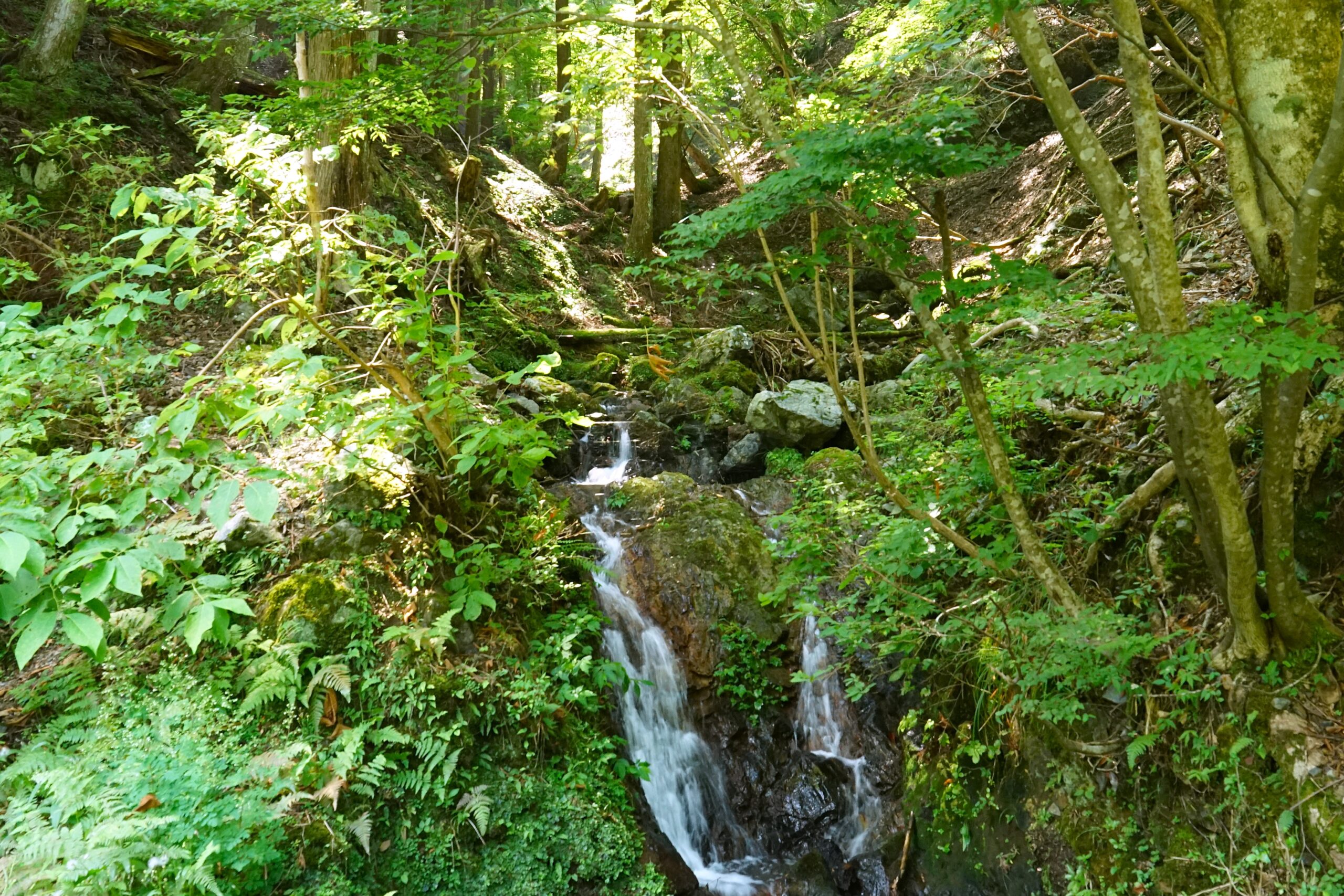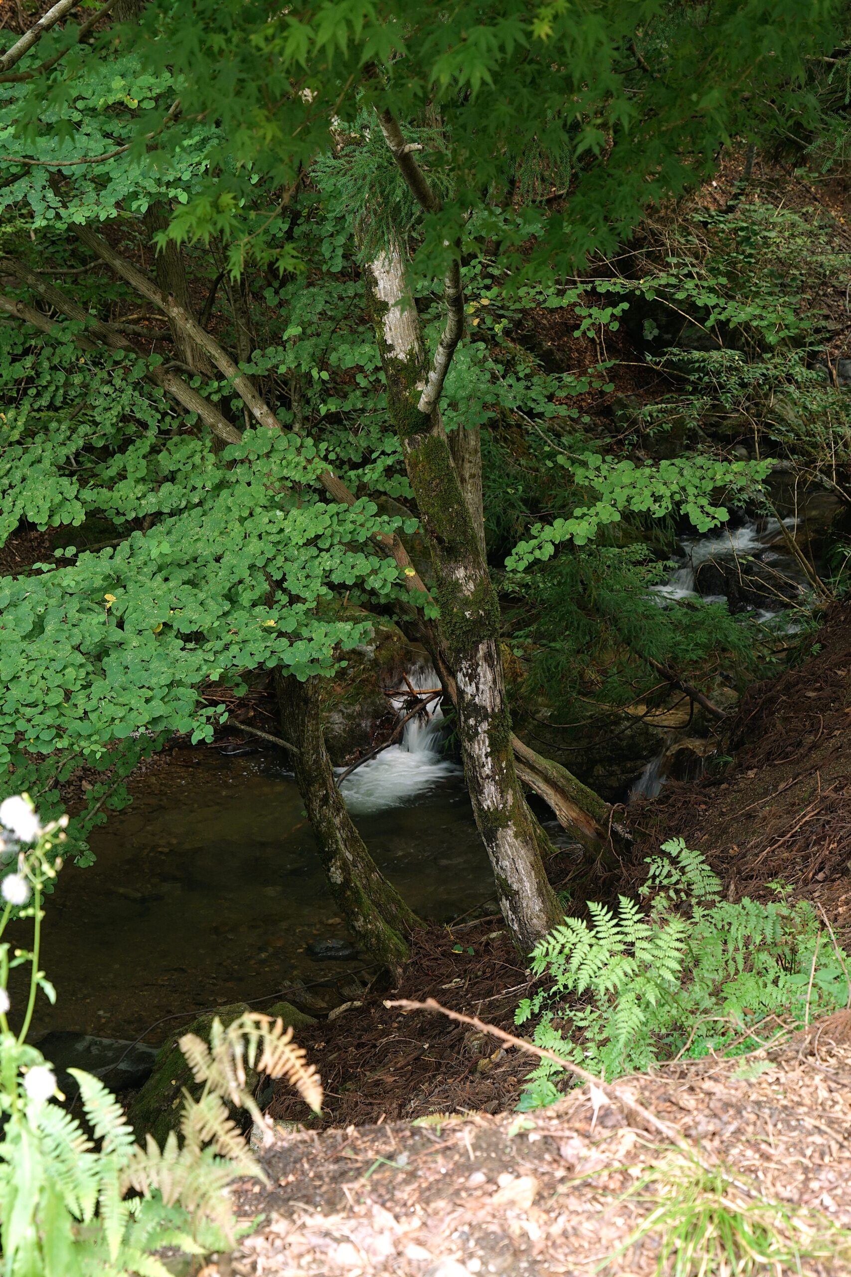 案内板の近くには小さな滝もあり、静寂の中に響く水の音がとても印象的でした。