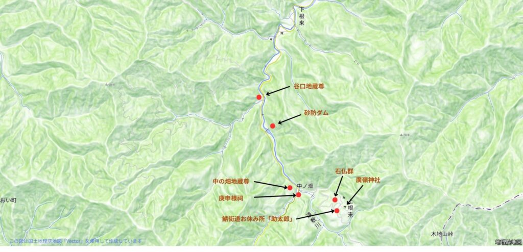 中の畑地蔵尊から約2km進むと、上根来に到着します。石仏群を過ぎると集落の入口です。