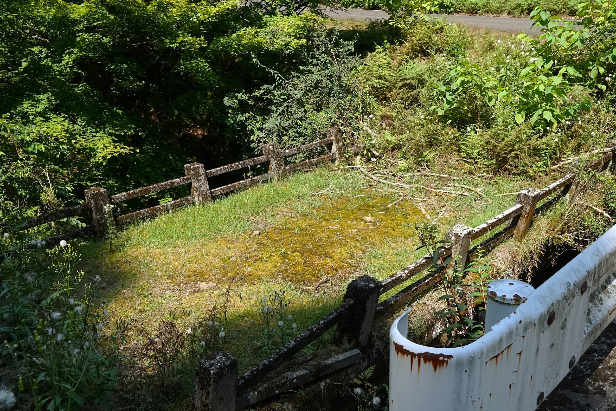橋の手前右奥には、八百比丘尼の墓があります。夏場は草が生い茂っていたため近くまで寄れず、今回は県道から撮影しましたが、やや分かりづらい印象でした。