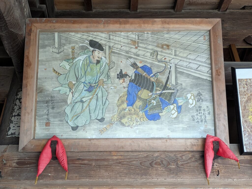 この鵺退治の際に使われた矢は、この集落の山鳥の羽を使って作られたと伝えられています。その矢にちなんで、この地は矢代と呼ばれるようになったそうです。