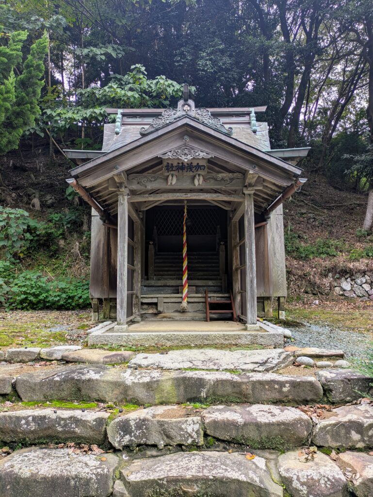 苔の生い茂る石垣と長年の雨風に耐え抜いた本殿の古色から、矢代の人々の願いの場となっていた過去の情景が思い浮かびます。