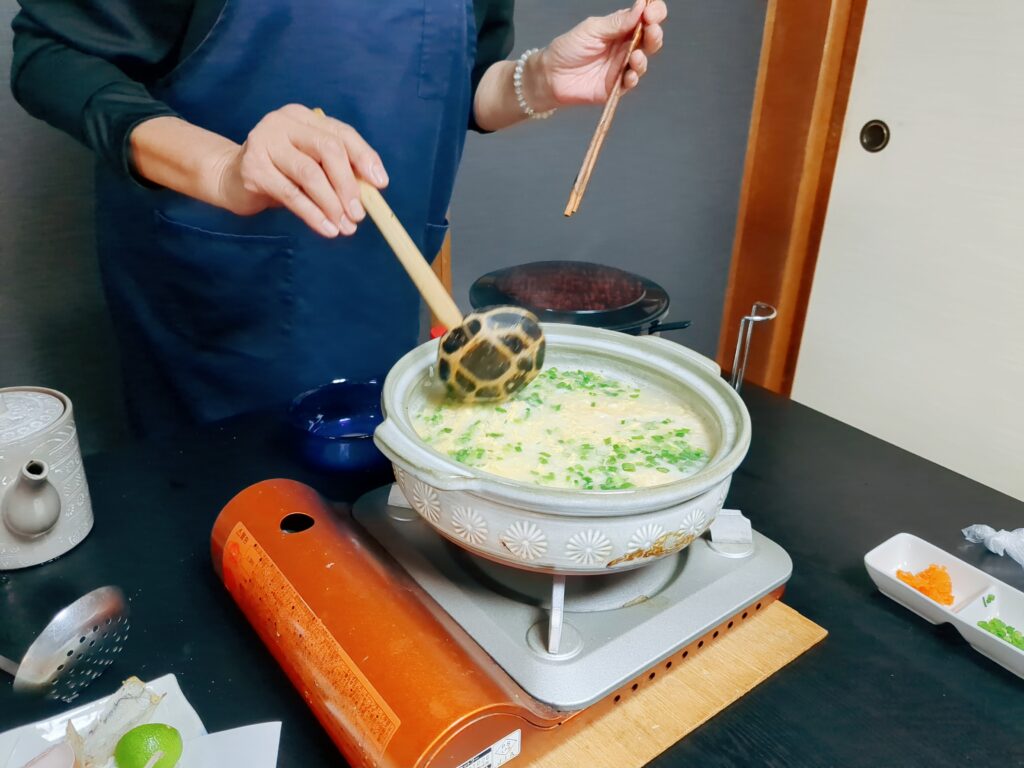 ここで、女将さんから「ふぐ鍋を美味しく炊くコツ」を教えていただきました。