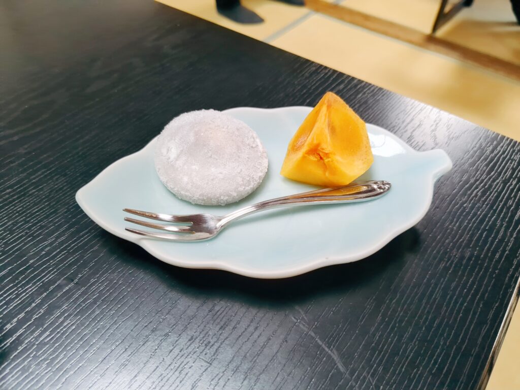 この日は柿と、ひんやりとしたアイス饅頭のようなデザートでした。