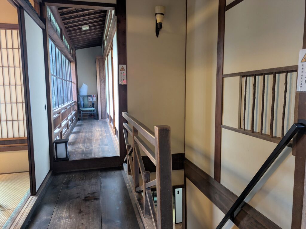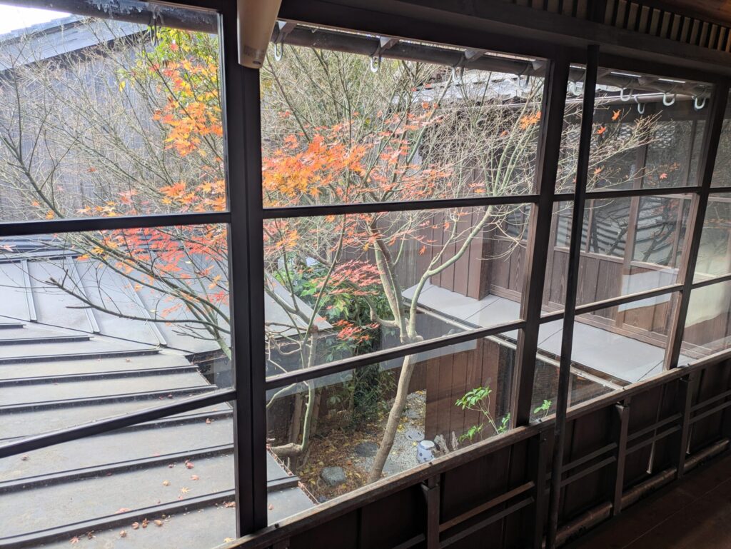 2階には廊下を挟んで和室の個室があり、当時の様子が窺えます。窓からは中庭の紅葉を間近に見ることができて、風情を感じることができます。