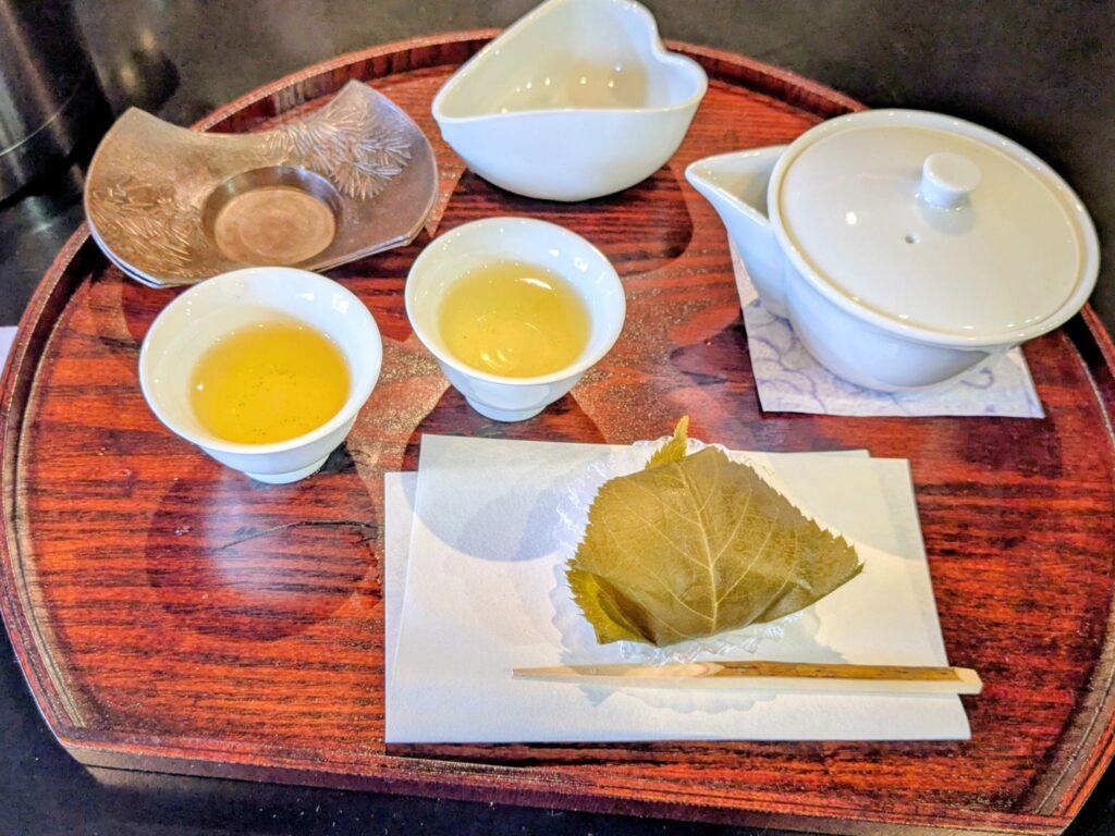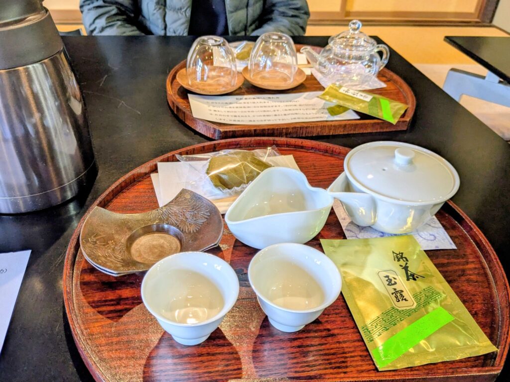 いろいろなお茶を淹れることができます。この日選んだのは「和紅茶」と「本玉露」です。別料金で和菓子もつけていただけるとのことで、そちらも一緒にお願いしました。