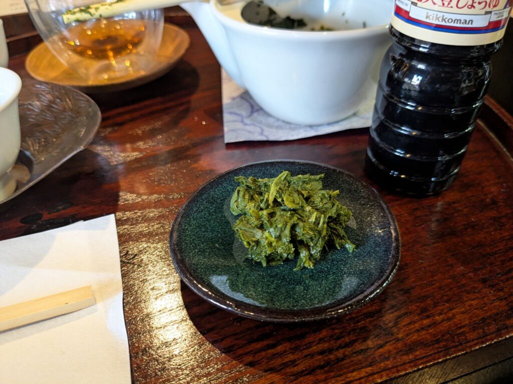 3杯目を楽しんでいると、「最後は茶葉も食べられるんですよ」とお店の方に教えていただき、お皿とお醤油を出してくださりました。