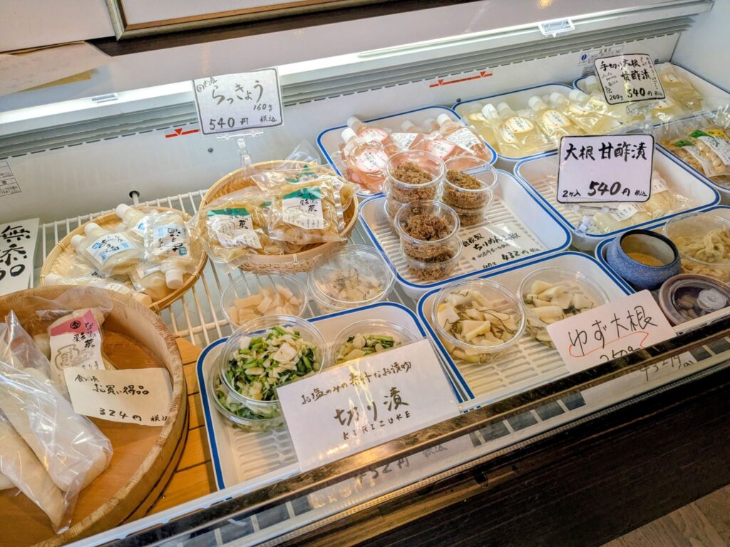 店内の片隅には、無添加の手作りお漬物コーナーもありました。保存料を使わず、素材本来の色と味を活かしたお漬物たちは、見ているだけで白いご飯が欲しくなります。