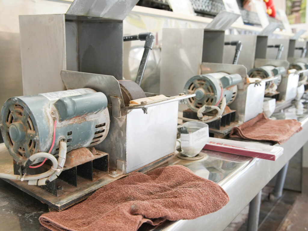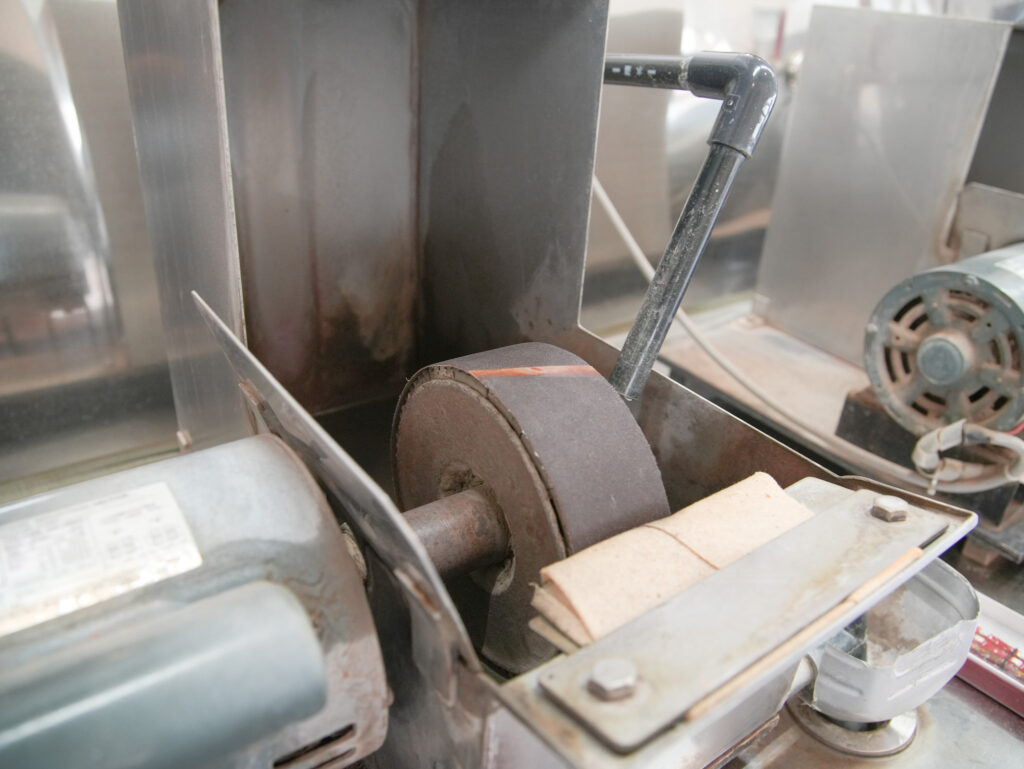 ボコボコとしているのがわかるかと思います。ここに色々な模様となる貝殻や卵の殻などが入っています。この箸をゆっくりと機械で研いでいきます。