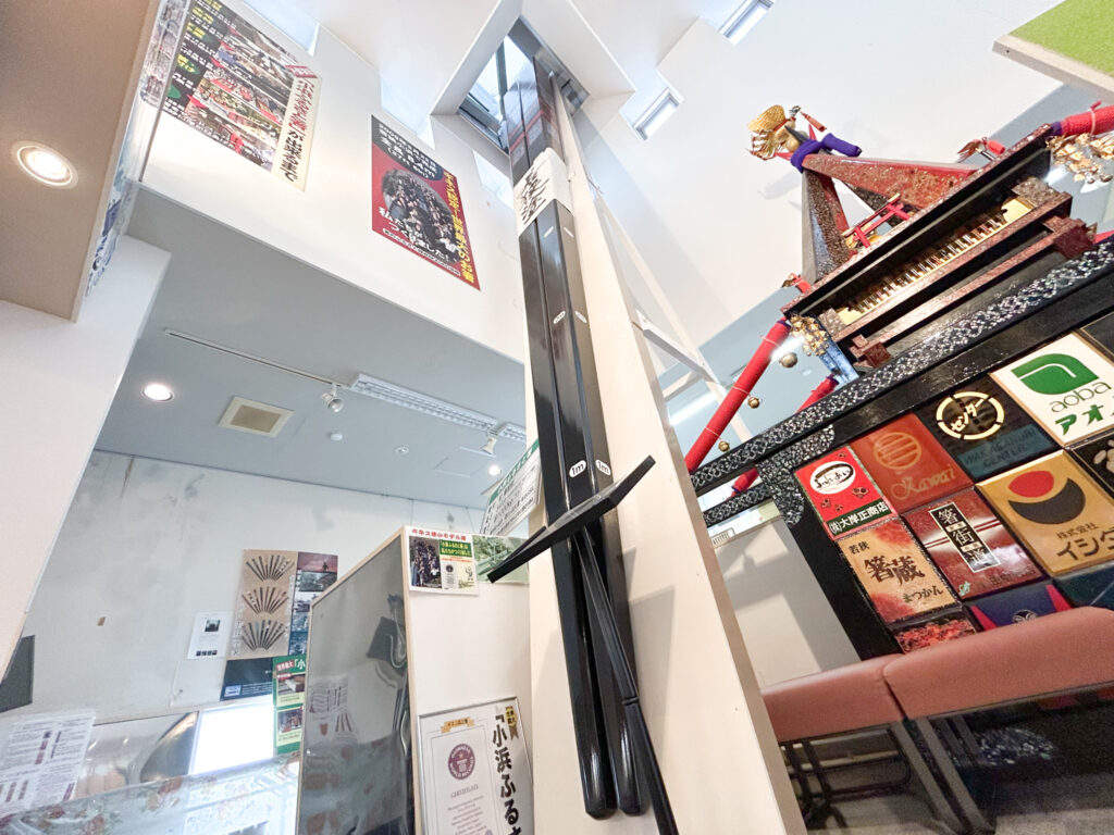 館内に入ると、目に飛び込んでくるのが伝統工芸の力を生かした巨大な箸と神輿です。2009年に小浜で完成した「小浜ふるさと箸」は、全長8.4mでギネスにも認定されました。素材が到着し、木地の製材、下塗作業を数回に分けて行いました。その後、塗装と模様をつけ、仕上げにサンドペーパーで研ぎました。およそ4か月かけてこの巨大な箸は完成したそうです。なかなか写真では、伝わりきらないと思うので、これは現地でチェックしてみてください!