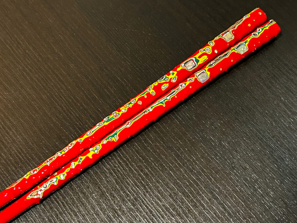 若狭塗箸は、細工された竹などの木地に漆などの塗料を塗り重ねます。そして、塗料の色を変え、途中で卵の殻や貝殻をつけ、最後に研磨をすることで独特で美しい模様を生み出しています。伝統的な工法で作られている若狭塗箸は、塗り重ねの工程を何度も何度も繰り返し、箸先も細いのが特徴です。木地作りから完成まで数か月かけて制作されています。伝統的な工法は手作業ですが、現在は機械的に作られているものも増えていて、デザインも転写で作られてきているものが多いそうです。