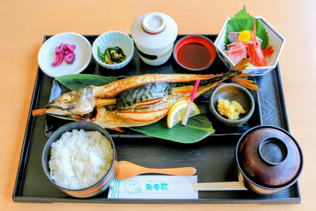 お魚センターの向かいにあるフィッシャーマンズワーフ2階のレストラン「海幸苑」にて食べることができます。じっくり焼き上げられた鯖は、香ばしい香りが食欲をそそる逸品です。生姜醤油と一緒に食べると鯖の美味しさそのものを存分に感じられる、観光客にも地元の方にも長年愛されている小浜を代表するグルメの一つです。