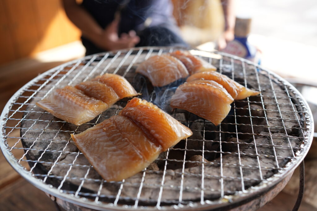 実は、若狭小浜お魚センターでは、 新鮮な魚介類や醤油干しを購入出来るだけではなく、敷地内にある七輪焼き広場にて炭火で焼いて食べることができます! 係の方が炭火を起こしてくれるので、誰でも気軽に楽しめます◎ またお皿やお箸、トングなどの調理器具やお醤油やお塩など必要最低限のものは揃っているので、手ぶらで訪れることができます。