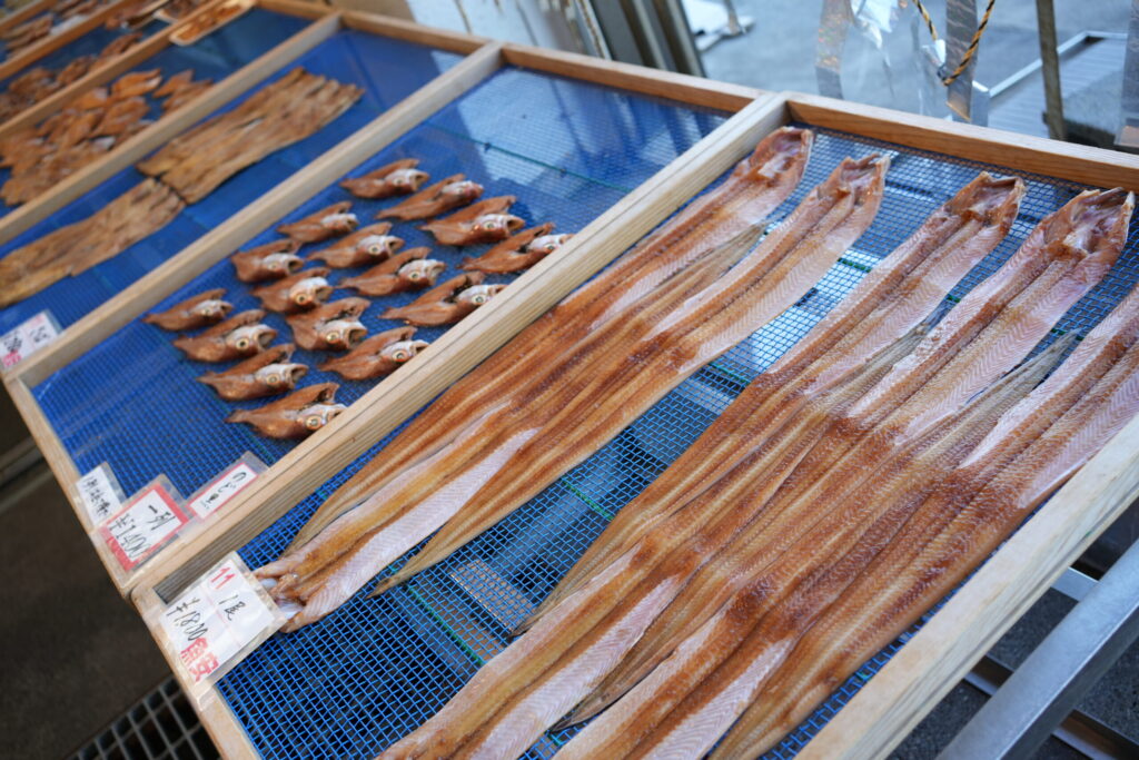小浜の市場に並ぶ干物は「若狭おばま醤油干し」がメイン。鯖の他にも、小鯛やハタハタ、カレイなども。