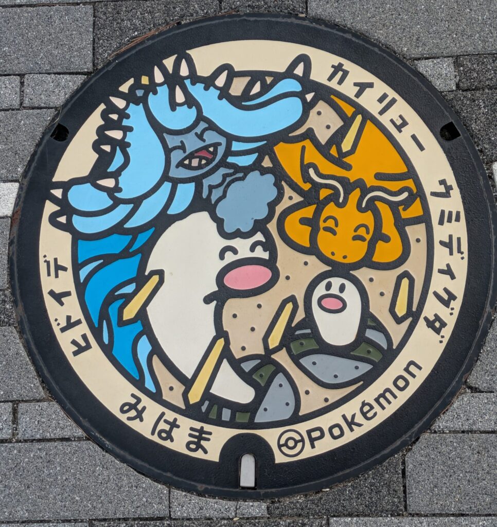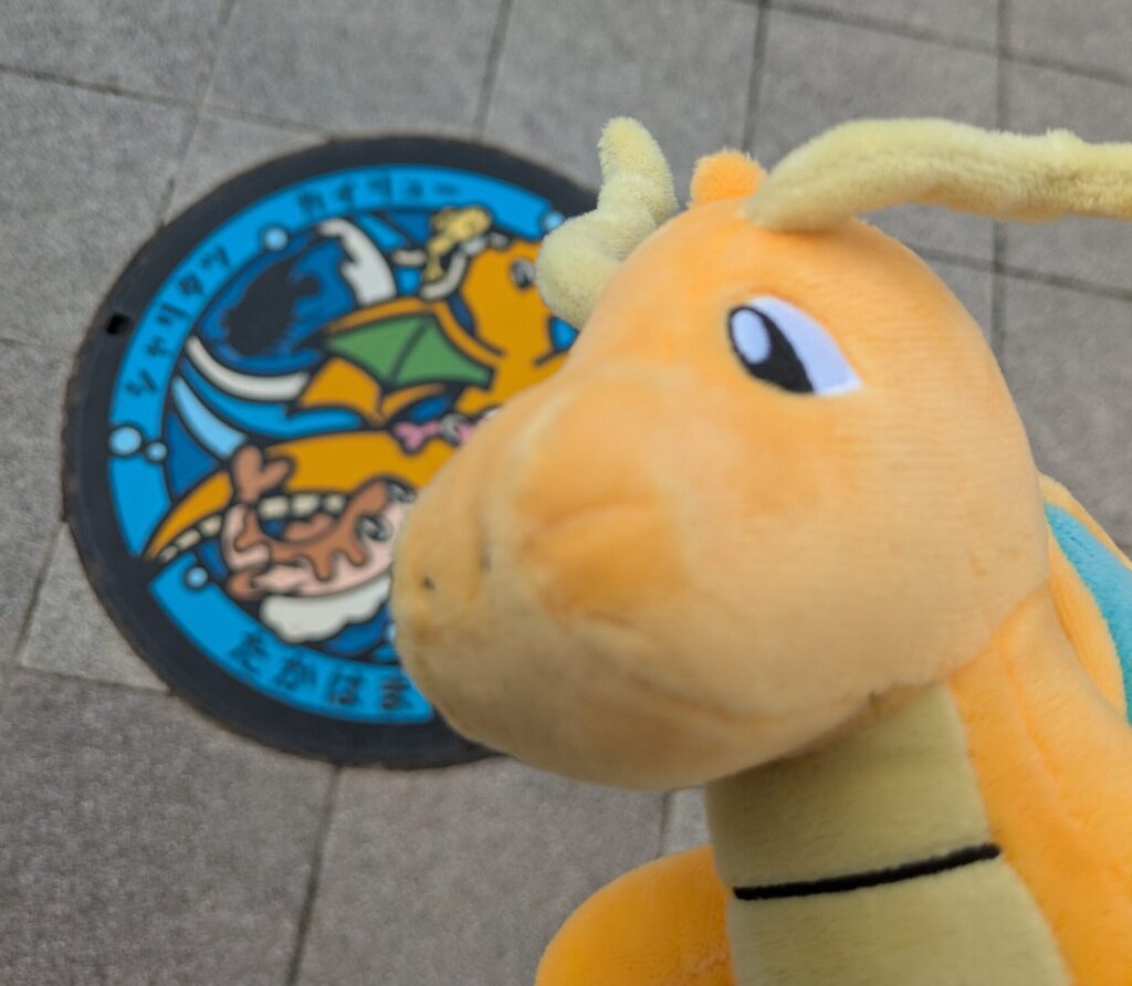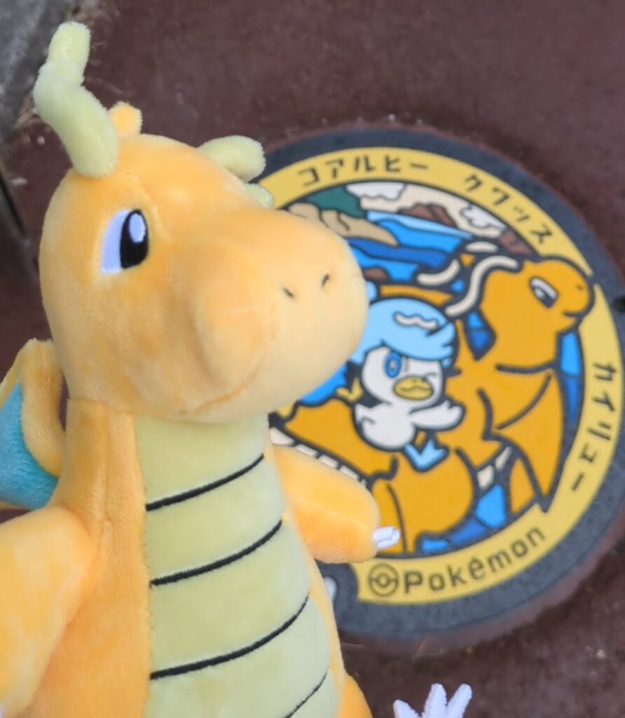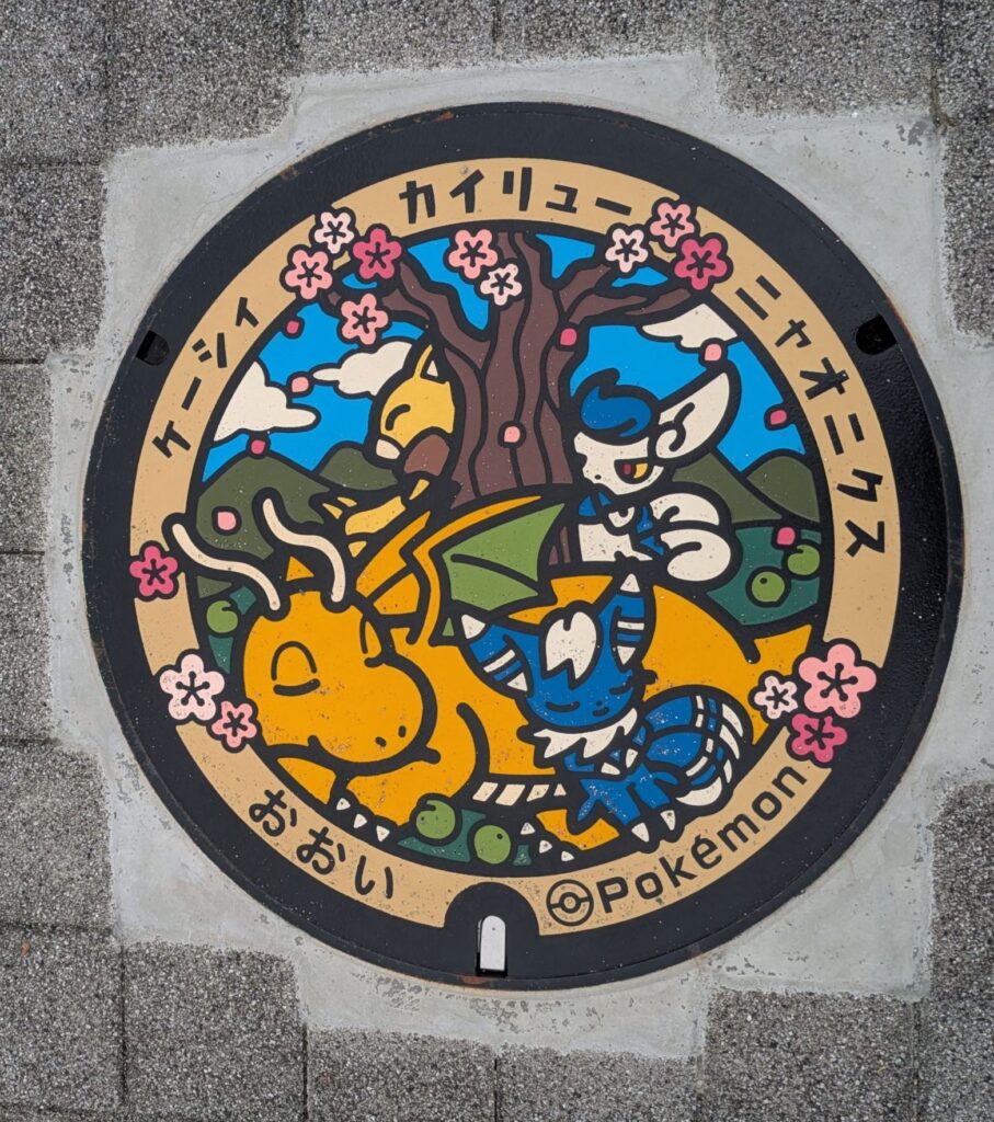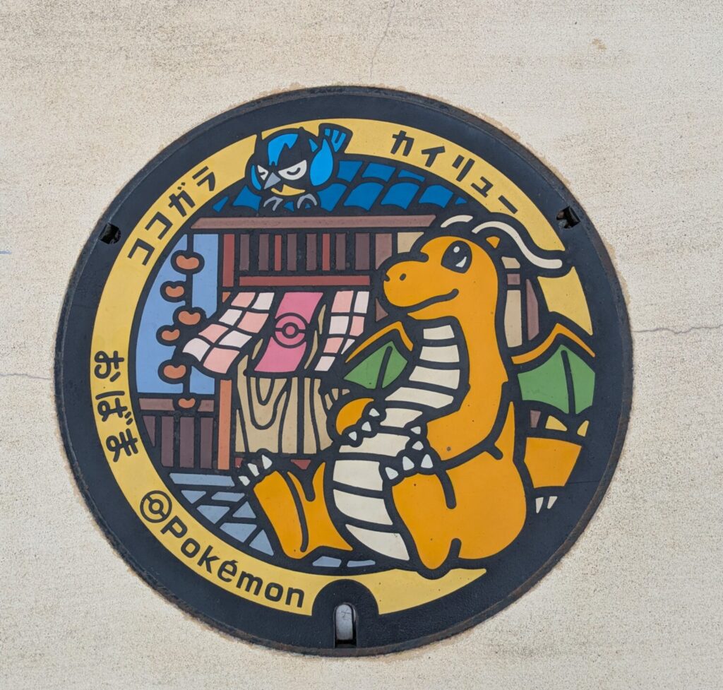 福井県らしい恐竜モチーフのポケモン「カイリュー」がデザインされたマンホールが設置されています。