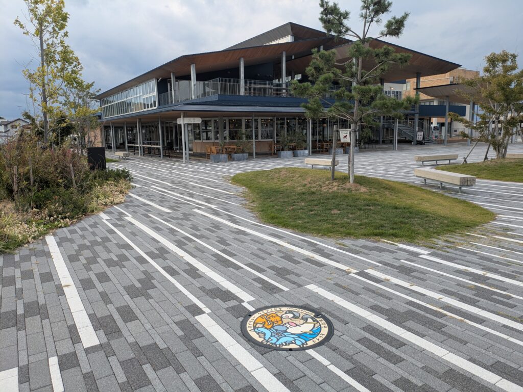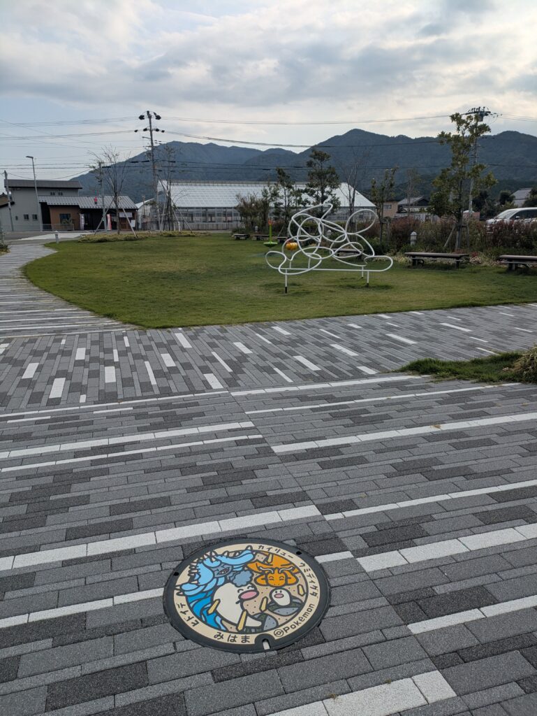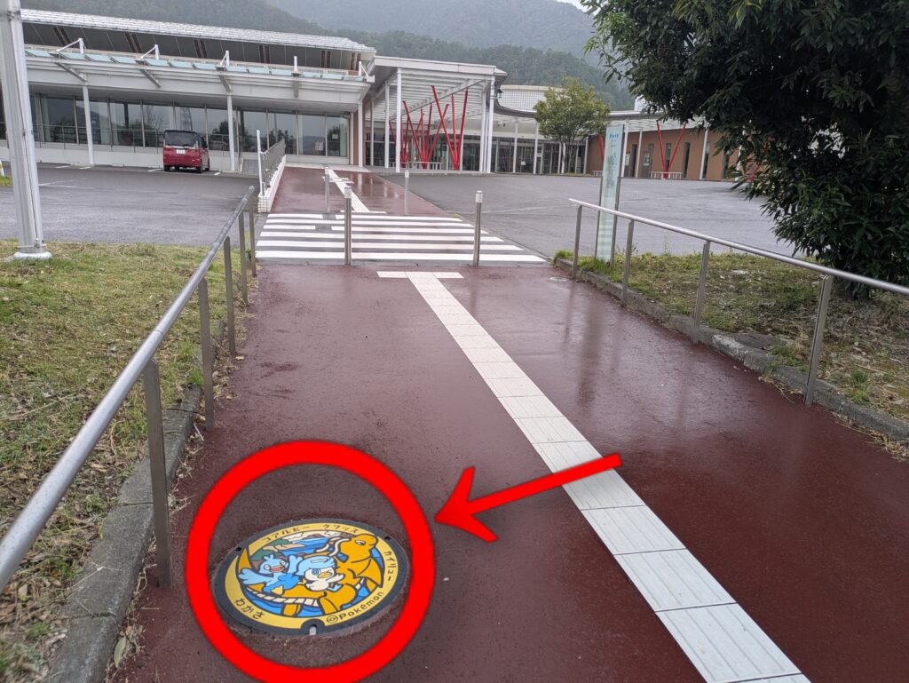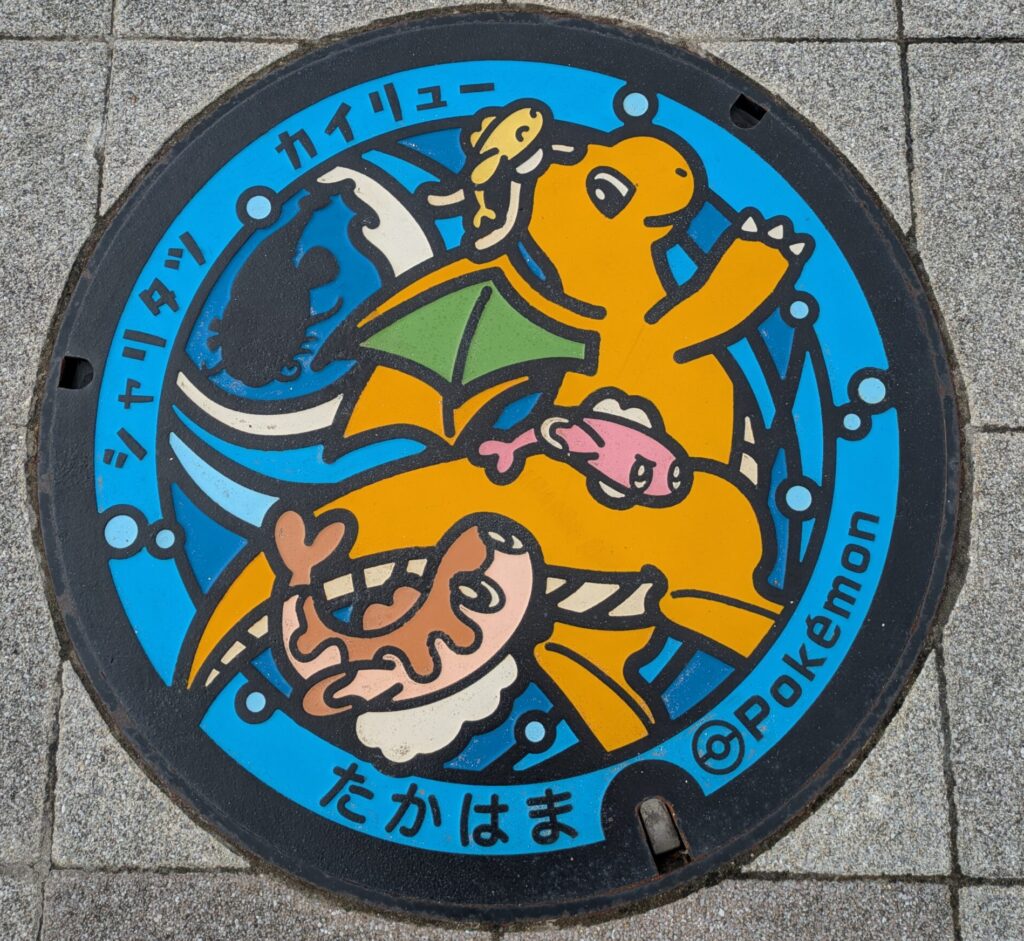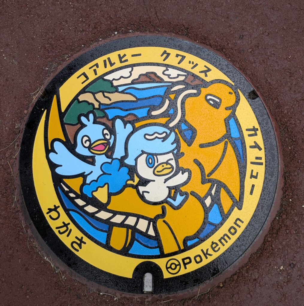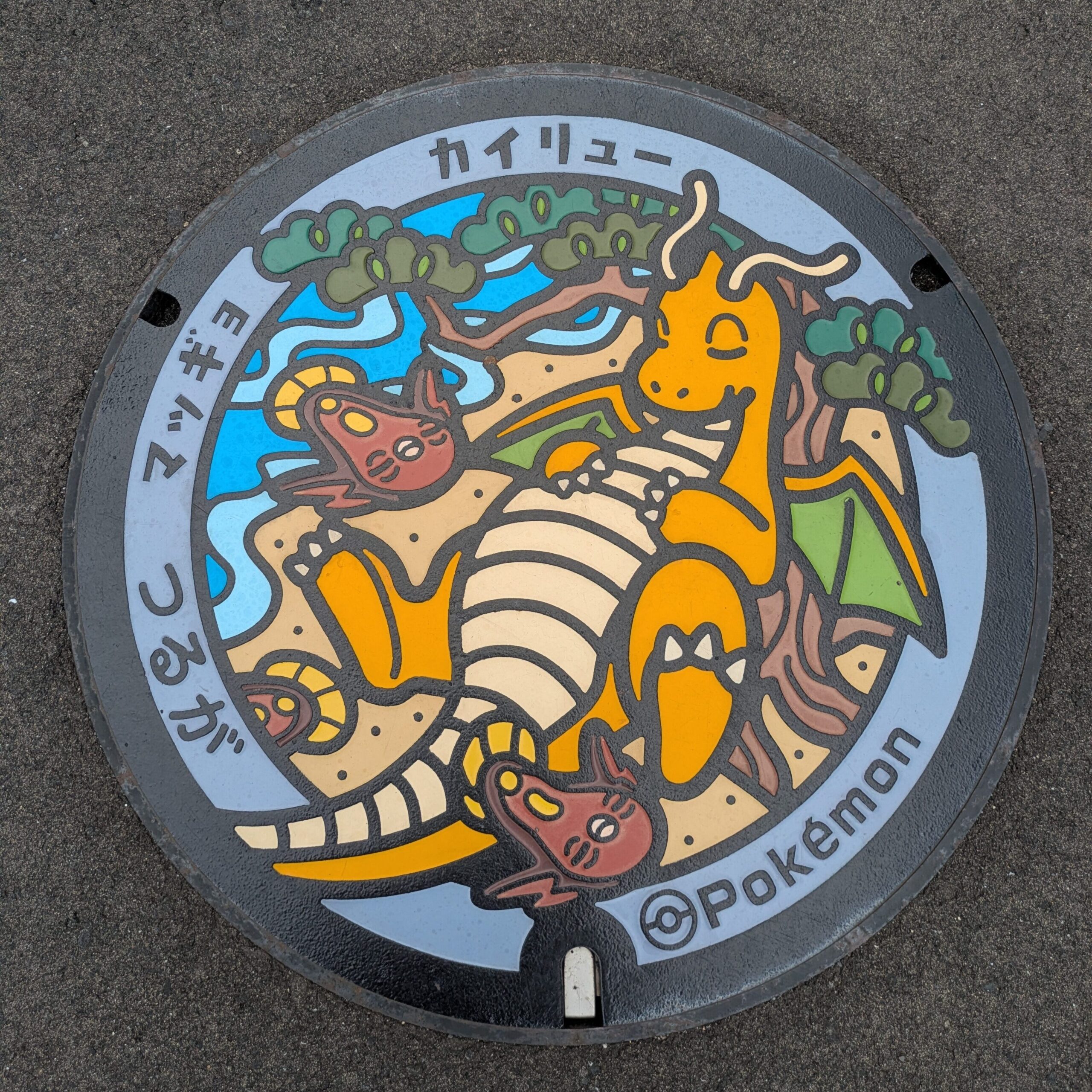 福井県らしい恐竜モチーフのポケモン「カイリュー」がデザインされたマンホールが設置されています。