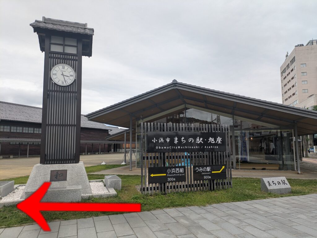 小浜市のポケフタは、下の写真のようにまちの駅の時計台から左手に進むと旭座の前にあります!